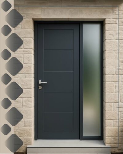 Alliez design et sécurité avec cette porte d’entrée en aluminium gris anthracite, parfaitement intégrée à une façade en pierre moderne.